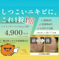 Mona Clinic(モナクリニック)は、医師による診察の後、イソトレチノイン、トラネキサム酸、ビタミン剤などの治療薬を処方します。