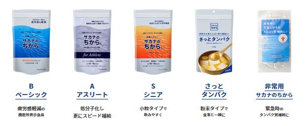 サカナのちからでは、5種類のサプリ(ベーシック・アスリート・シニア・さっとタンパク・非常用)を展開しています。