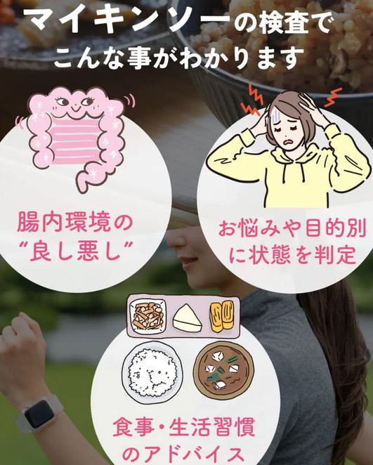 マイキンソー(Mykinso)腸内フローラ検査は、約1,000種類存在するといわれている腸内細菌の状況を解析できる検査キットです。