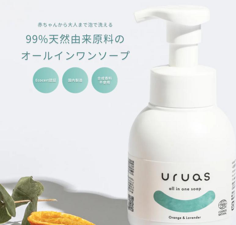 uruas(ウルアス)オールインワンソープは、赤ちゃんから大人まで、全身に使えるボディソープです。