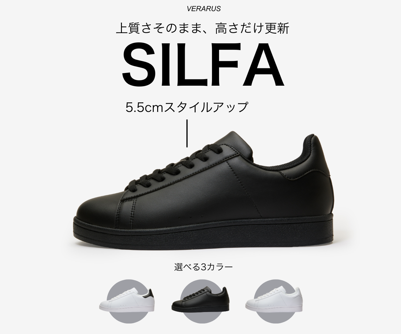 VERARUS(ヴェラルス)の身長アップシューズを履くだけで、身長を5.5cm~6.5cm伸ばせます。